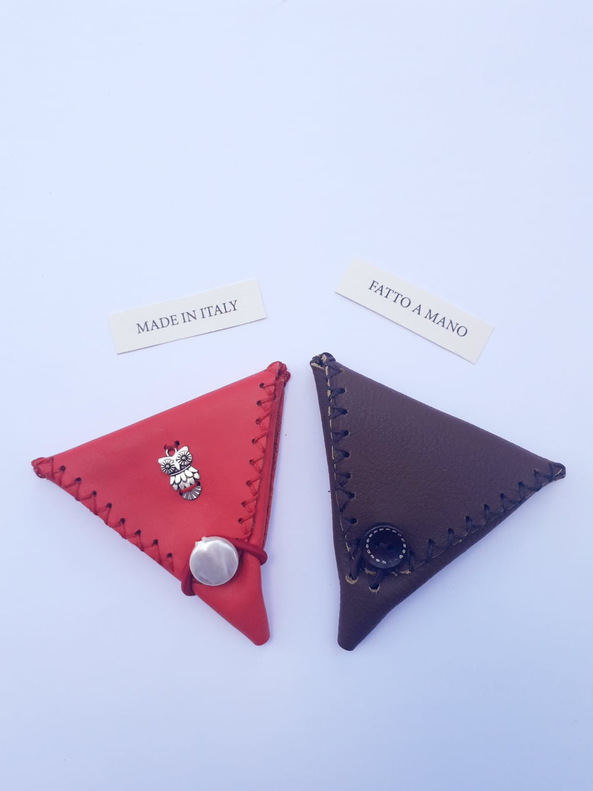 Portamonete realizzati con particolare forma triangolare, in morbidi e pregiati pellami in vari colori.