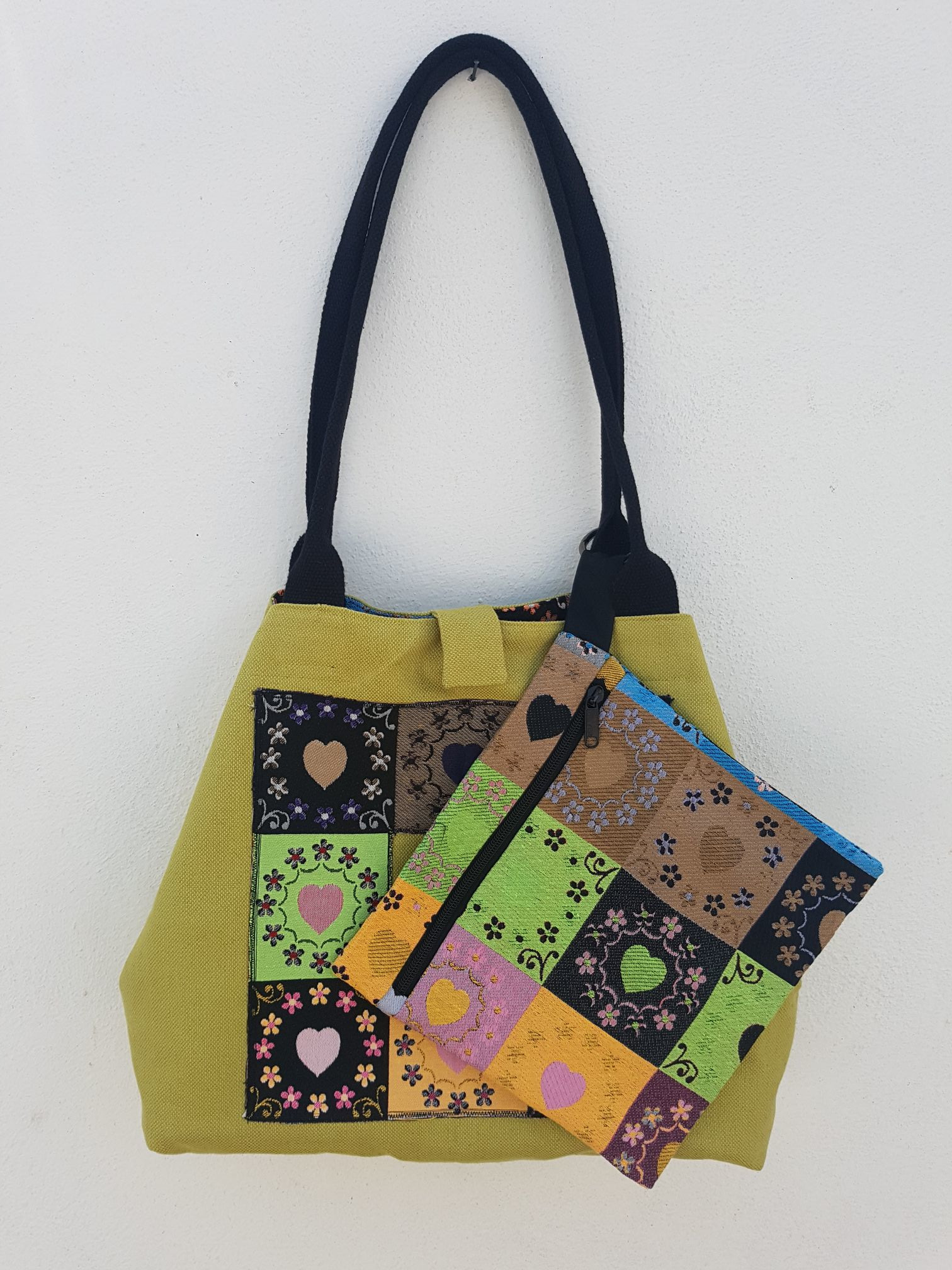 Borsa da spalla in tessuto reversibile, busta con zip con gancio , chiusura borsa calamitata con gancio, fondino rigido estraibile, ricamo a mano libera.