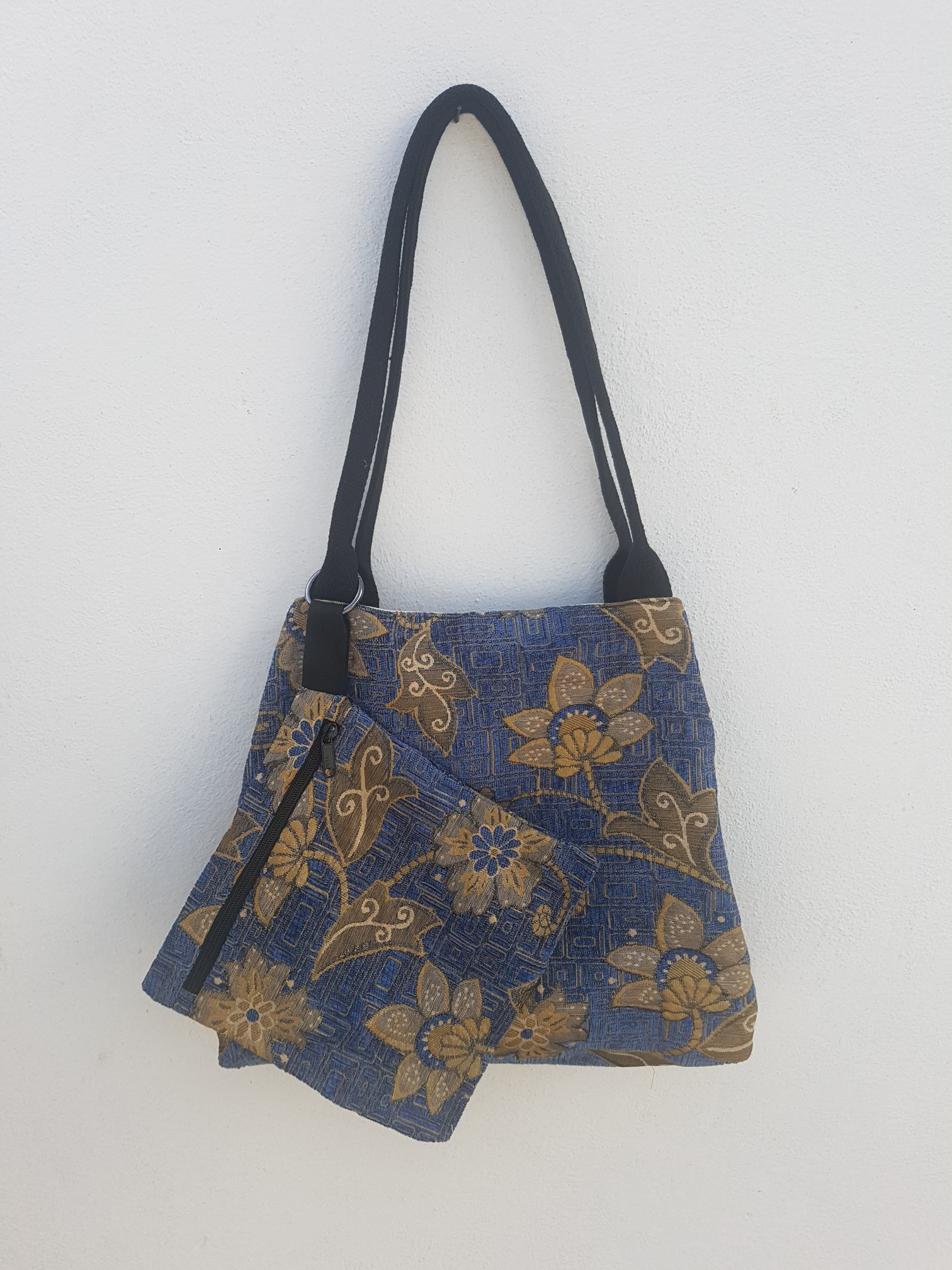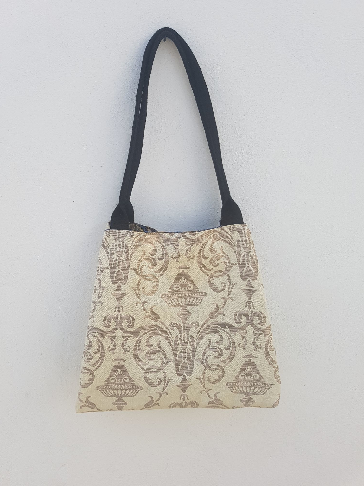 Borsa da spalla in tessuto reversibile, busta con zip con gancio , chiusura borsa calamitata con gancio, fondino rigido estraibile, ricamo a mano libera.