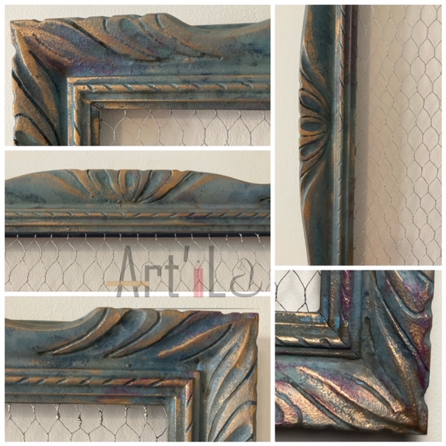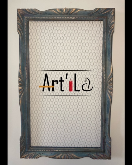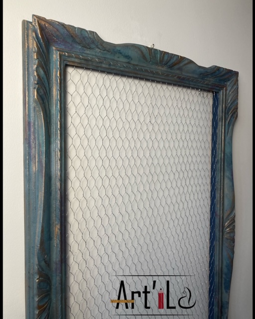 Cornice dipinta a mano, effetto materico in sfumature di blu e punti luce in color bronzo. Assolutamente versatile! Applicando ganci o mollettine alla rete può diventare porta oggetti, foto, bijoux e altro ancora!