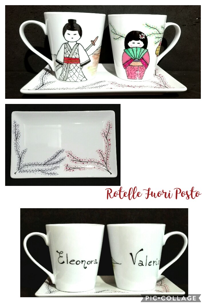 Tazze, mug e tazze con piattino, disegnate e dipinte a mano, con possibilità di personalizzazione con disegni, scritte o altro. Si possono realizzare tazze singole o servizi di due o più. Ogni oggetto è dipinto con colori per ceramica termofissati mediante cottura, lavabili a mano senza spugnette abrasive, in lavastoviglie a bassa temperatura, adatte anche al microonde.