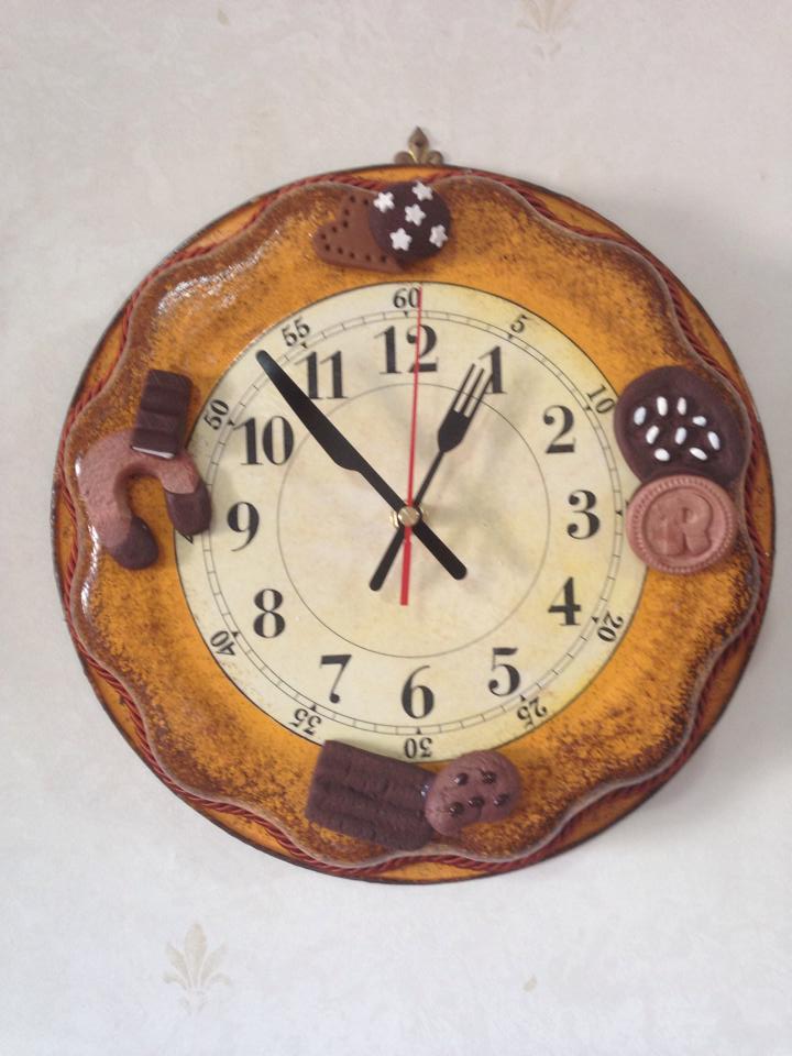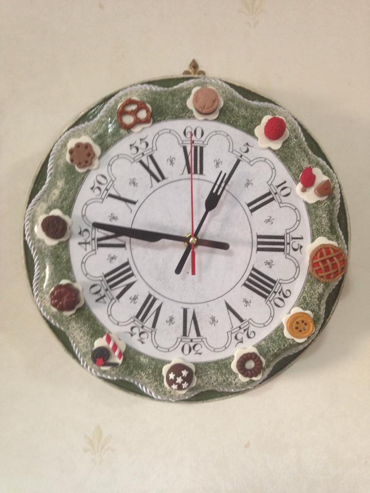 Orologio realizzato con la tecnica del mixed media su teglie di varie misure e forme con decorazioni di dolcetti e biscotti fatti con paste polimeriche